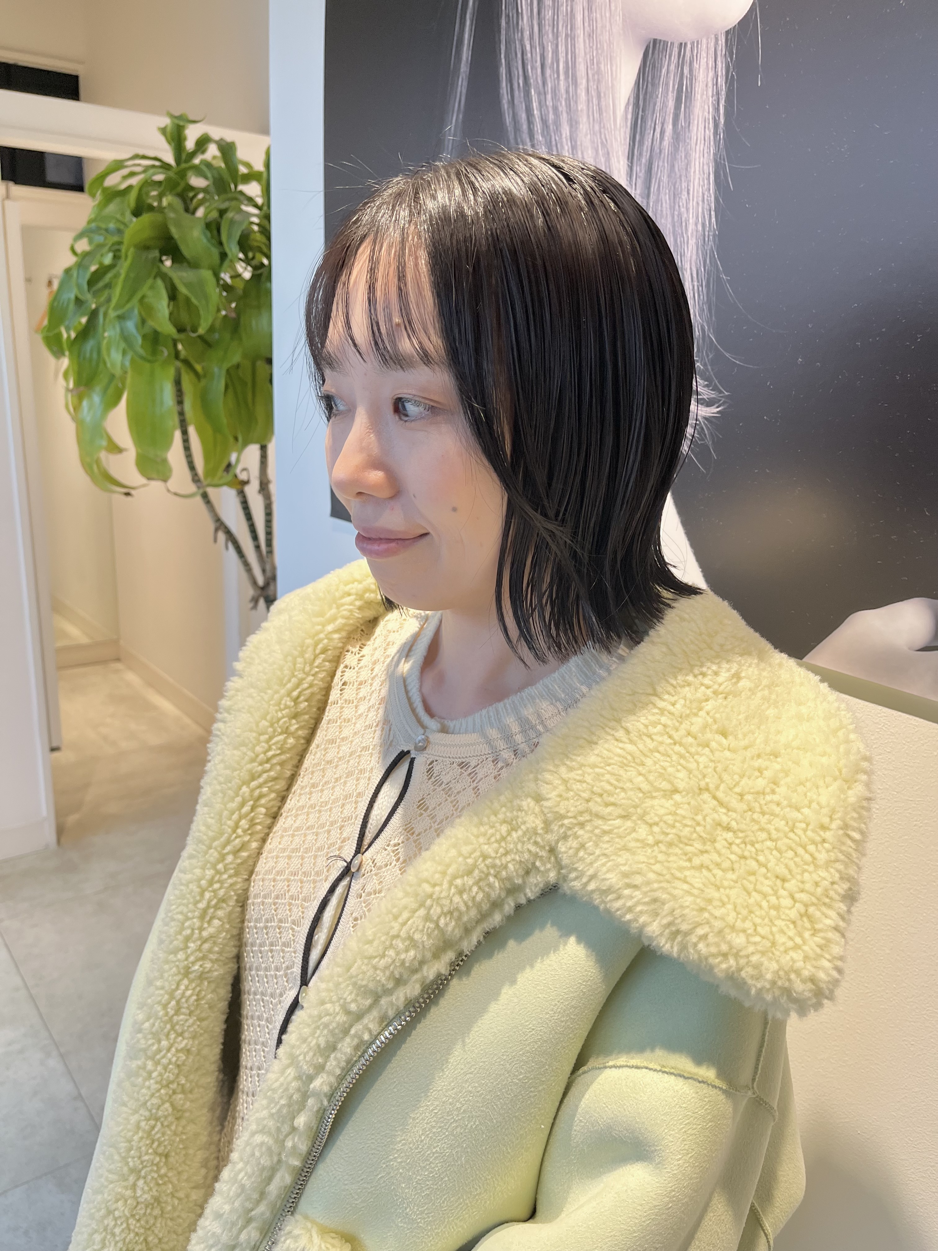 今回は切りっぱなしボブをアイロンで外はねにスタイリングしました。