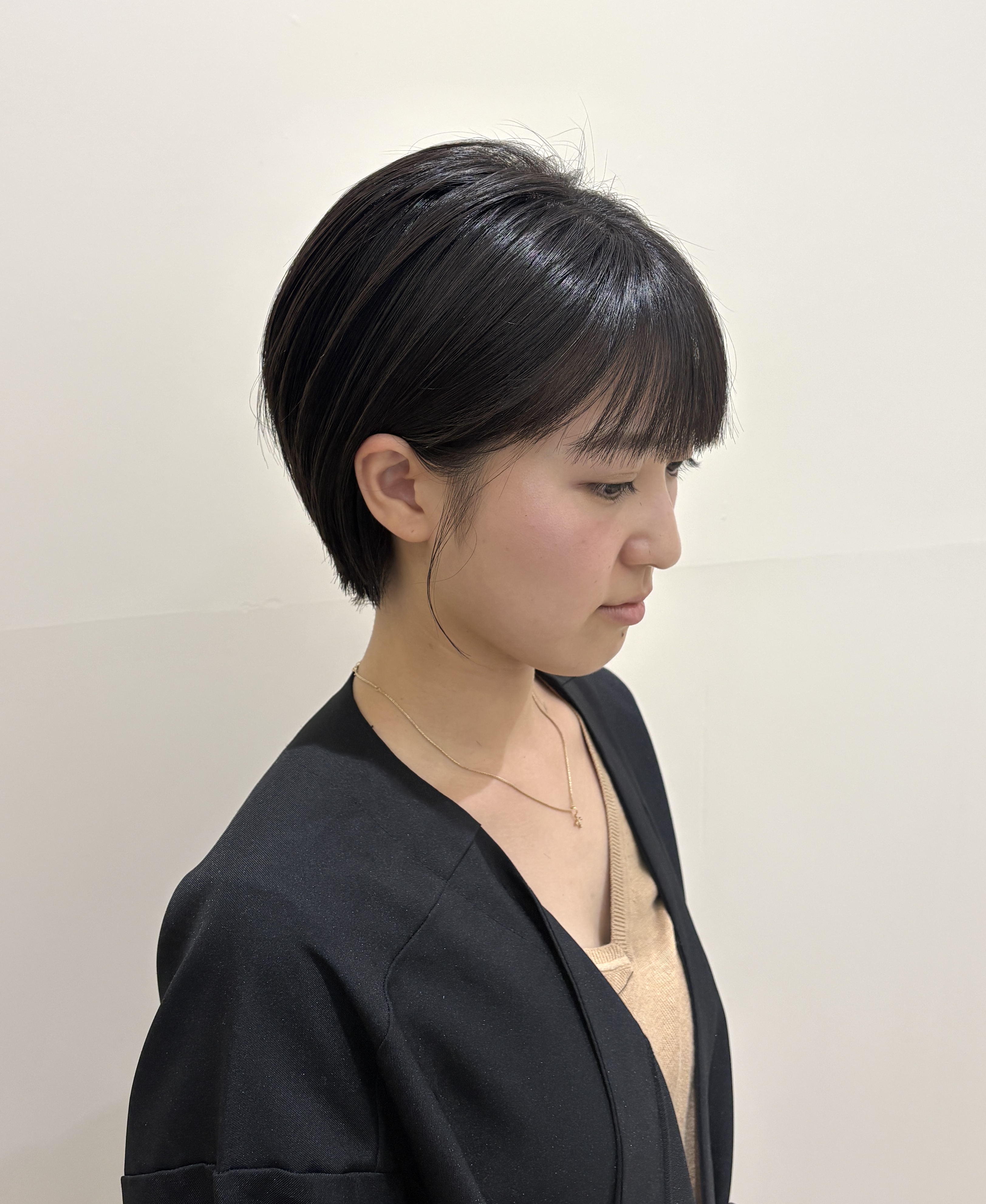 後頭部に自然な丸みを出した女性らしさと、すっきり感を両立したショートスタイルです。