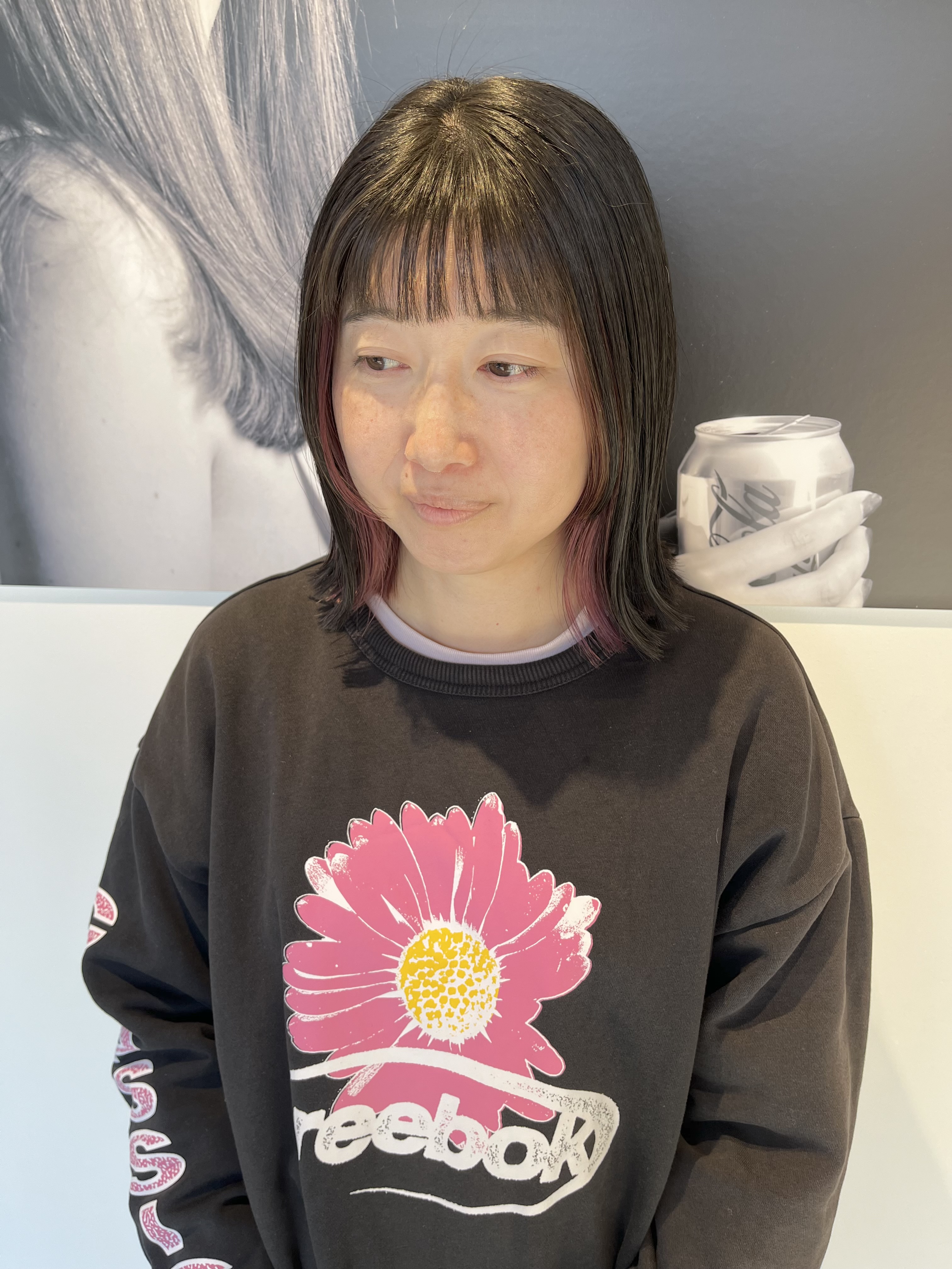 ボブ×インナーカラー 顔まわりに短い毛を作ったデザインカットに♪インナーカラーはブリーチ後ピンクカラーを入れました。 スタイリングはタイトにオイルとバームで仕上げました。モッズヘア青山プリヴィレージュ店 スタイリスト 若藤